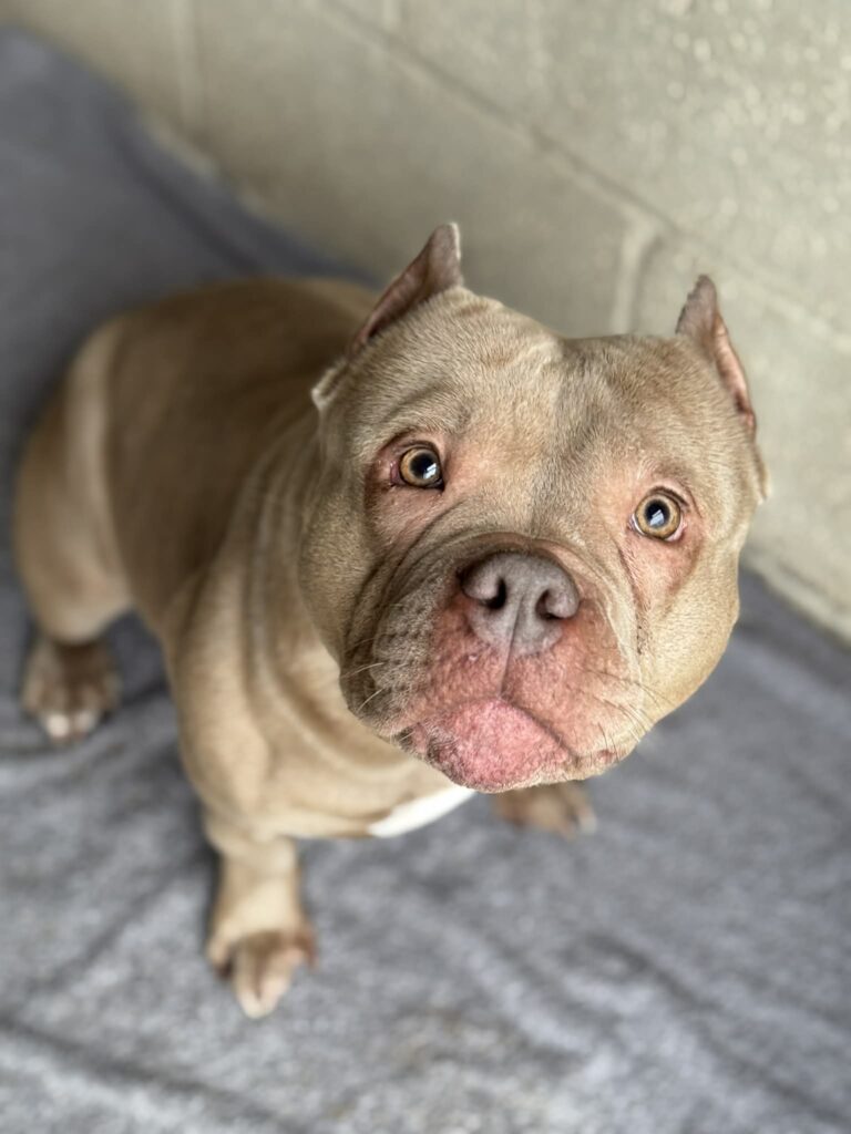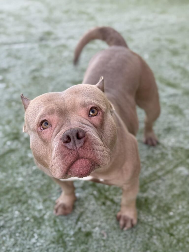 Little miss Coco is a gorgeous short legged Pocket Bully who is approx 4-5 yrs old. She is a proper little character and personality wise we would describe her as being a mix of Bulldog and Staffy personalities – giddy, loving and excitable but also quite low energy – dare we say a bit lazy, a bit sassy and stubborn and very loyal! She is an angel in her kennel – totally clean, quiet and often found on her back in her bed snoring away! She would be fine being left for 4-5 hr periods – as long as she has a comfy bed she’ll be happy. She is not a girl who needs or wants a lot of exercise – she will walk nicely on her lead, but hasn’t been used to walks in her previous home, so it’s all new for her and she can get a bit spooked and worried by certain things (such as loud traffic), and will stop walking/want to get back ‘home’, so she needs her walking areas to be nice and quiet and would not suit an active home who want to do lots of walking. She’ll also need access to a secure, private garden. Coco LOVES her toys – she gets super excited for cuddly toys and will wiggle around with a teddy in her mouth (and then destuff it after haha!). Coco needs a quiet, pet free home and would be best with older children. She needs a home who know and love bully breeds and can give her all the love, cuddles, teddys and TLC that she really deserves.