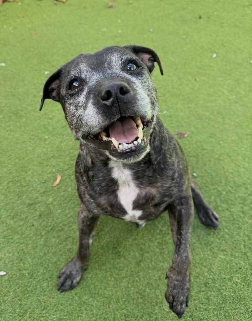 Beautiful Brindle Mia is an absolute dream girl. She is a 9 yr old Staffy (a big bigger than a dinky little Staffy – she is approx 25kg). Mia is super friendly and adores people. She is also good with children. Mia is in foster care and has shown us just what a good girl she is. She is fully housetrained, and now can happily be left on her own for a few hours with no issues at all (she did take a little time to settle into foster care and in the first few days she understandably was a bit worried without company). She walks well on her lead and is OK with other dogs as long as they aren’t too much for her – she’ll have a grumble at very giddy dogs. A neighbouring cat visits her foster families garden, and Mia is fine with him, so we would consider her for rehoming with a confident cat. Mia does get stressed travelling in the car – she can manage, will get in a car OK, and is not travel sick, so essential journies are no problem, but as she really doesn’t like to travel, a home where she won’t be doing lots of trips with her would be best suited. She is in good health in general, but does have arthritis and is stiff/limpy on her legs, so has started on daily pain relief which has really helped her and she will need to continue this long term to keep her comfortable, happy and pain free. She really is a dream and deserves a 5* Staffy loving home who can give her the absolute best and treat her like a little Princess!