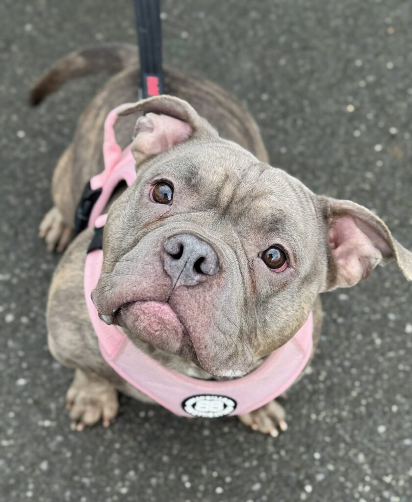 Little Miss Polly is 3 yrs old and is a Staffy/Bulldog type – she’s short and chunky with a great wiggle as she walks! Polly is a happy, giddy little girl who needs a home who love a dog with a bit of a cheeky, sassy, stubborn personality! Polly is very clean and quiet in her kennel, so appears to be housetrained and we think she’ll be fine to be left for a few hours. She loves getting out for her walks and is strong for her size and sets off at a good pace when she walks, so does need someone who can safely manage her when she pulls, but when she’s away from kennels she does settle. She is not dog friendly, and is very distracted when she sees another dog out and about, and will pull towards dogs until she knows they are well out of sight. She needs a pet free home with fully secure garden. Polly will be the perfect little girl for a family who know, love and are confident with Staffy/Bulldog types.