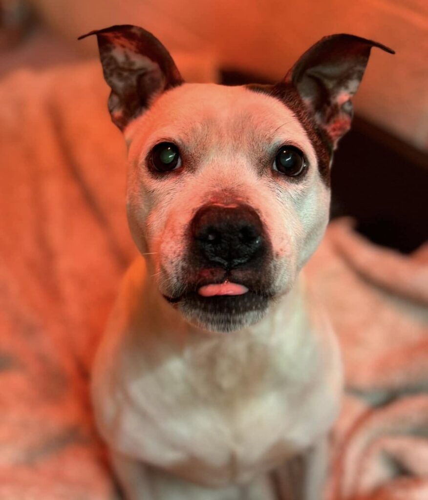 Gorgeous Winnie the Staffy is now ready to find her perfect Staffy loving forever home. Winnie is approx 10 yrs old and arrived with us as a stray in very poor condition, but thanks to lots of TLC by her foster family, and vet care, Winnie is now in good health and is a much happier more settled girl. Winnie is a typical Staffy who loves everyone she meets and is full of beans! She may be an older girl, but she is still quite active and giddy, and really enjoys her walks. She isn’t a fan of other dogs getting too close to her, so needs to be the only dog in her home (And she’s also a no to cats) – Winnie will be more than happy with all attention on her! She is fully housetrained and happily sleeps downstairs on her own. We think she would much prefer a home where she won’t be left for too long, as she loves company, but she should be OK for short periods once settled. She is such a special little girl who deserves to find a 5* Staffy loving home to spoil her rotten.