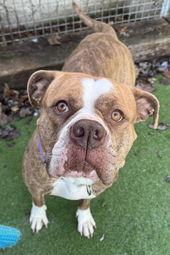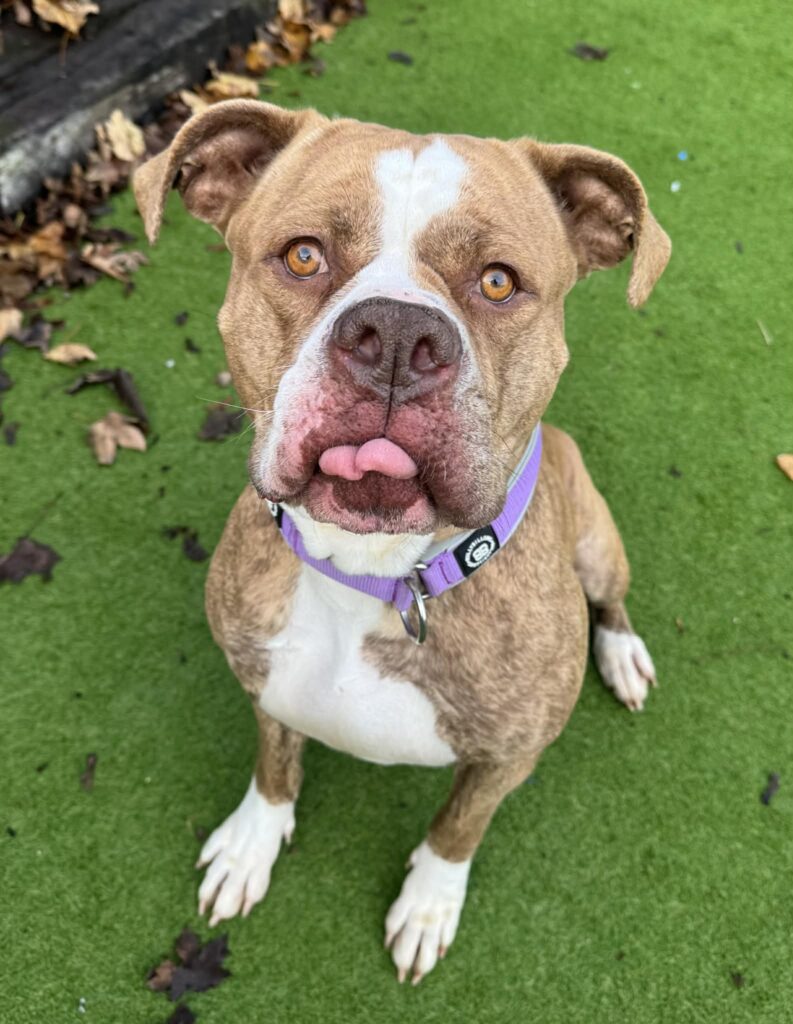 Beautiful Betsy is our new resident big softie – she is an American Bulldog/Mastiff who is 4 years old and would love to be in a large breed loving home lapping up all the attention in time for Christmas. Betsy is a very friendly girl and has been an absolute pleasure to look after in kennels. She is totally clean in her kennel (indicating that she will be housetrained), she does not chew, she settles well when she’s left. She walks very well on lead and generally just plods along, but would need someone who is confident with larger breeds purely because of her size. She doesn’t show any signs of reactivity towards other dogs, but we do think she will benefit from being the only dog in the home at this stage. Betsy has 2 main loves in life – FOOD! and SQUEAKY TOYS!! She’s very easily pleased!! She really is the most lovely girl who’s very ready to find her forever home.