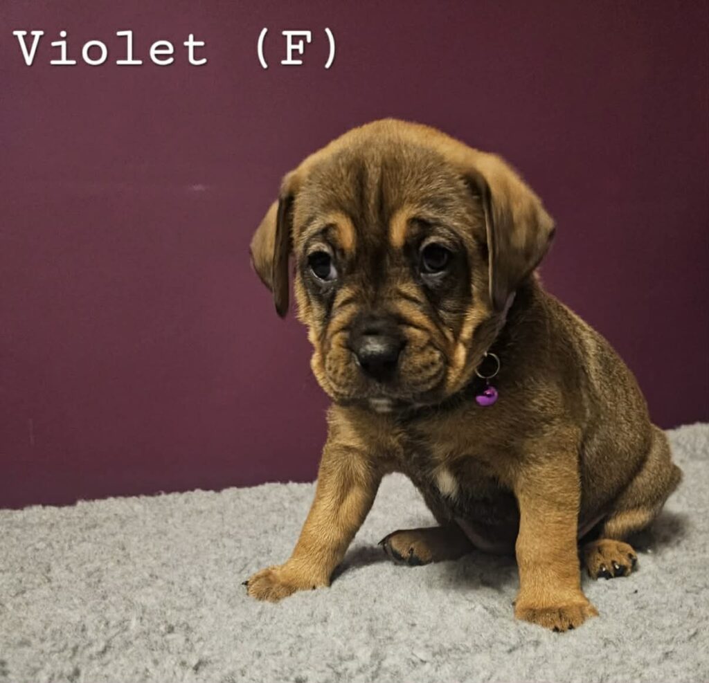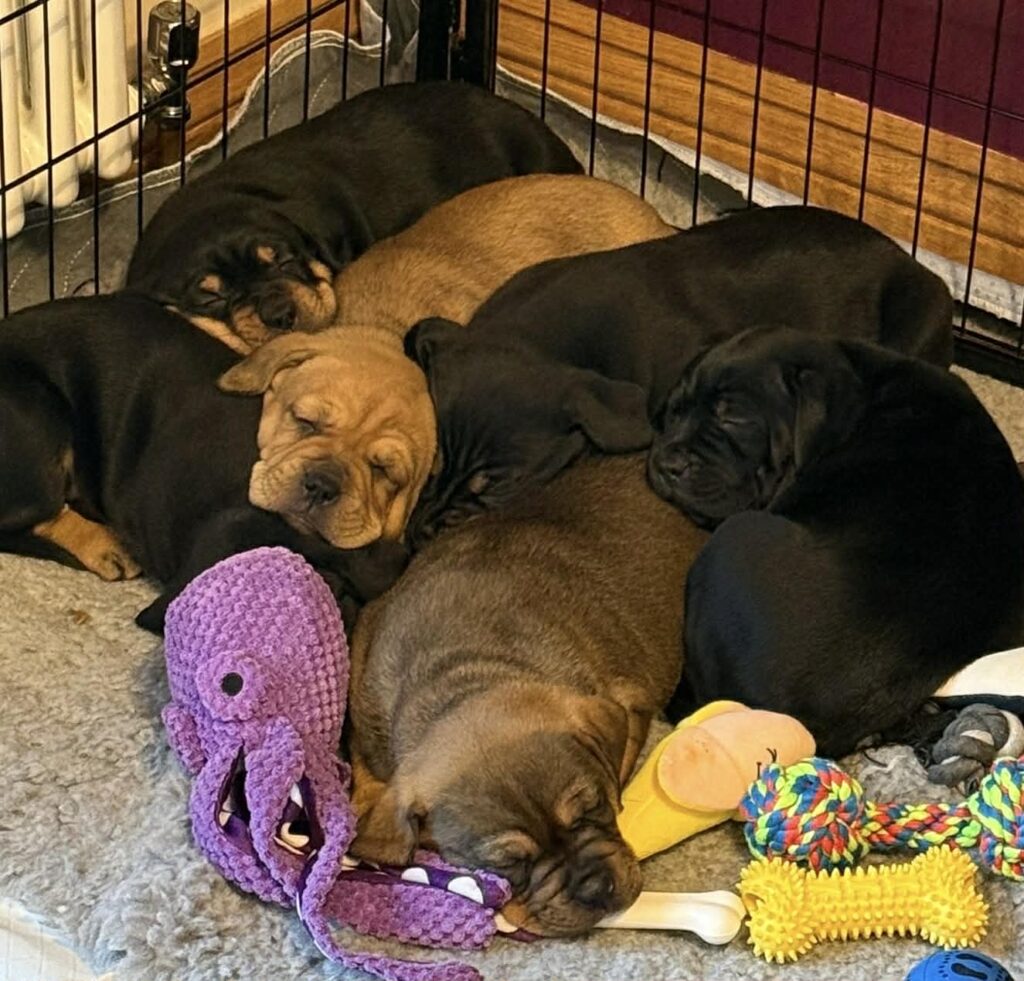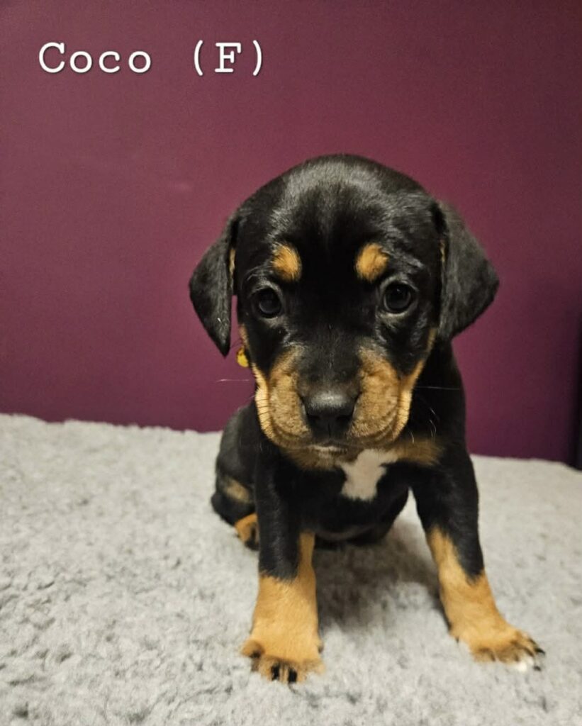 Applications are now open for Maple’s 6 beautiful cheeky, chunky puppies! They are almost 6 weeks old (born 28/11) and will be ready to leave for their forever homes from Fri 23rd Jan – please note: please only apply if you are ready to adopt on this date. Maple is a medium sized Staffy crossbreed (20kg approx), and we believe the father was a Rottweiler. Previous large breed experience would be ideal, but not essential. There are 5 girls and 1 boy in the litter. They would benefit from being rehomed WITH other dogs (neutered opposite sex larger breeds), and can be rehomed with other animals and children aged 5+. They will need committed homes who have the time, energy and patience to raise a puppy! Ongoing training and socialisation is essential. They are all very confident, cheeky (they are in their little land shark stage currently with their little needle teeth!), happy and playful little characters who will be the most amazing dogs who need to find 5* homes to ensure they all grow up into well rounded, confident and social dogs.