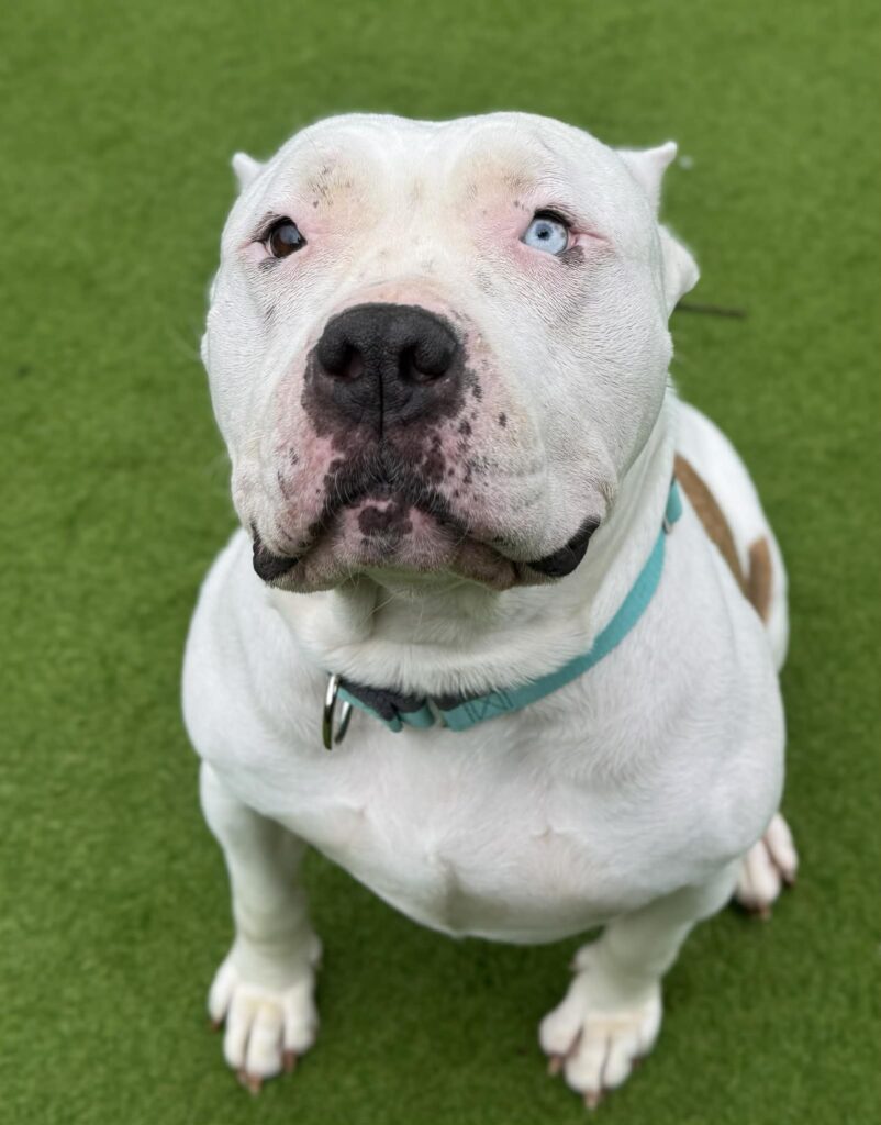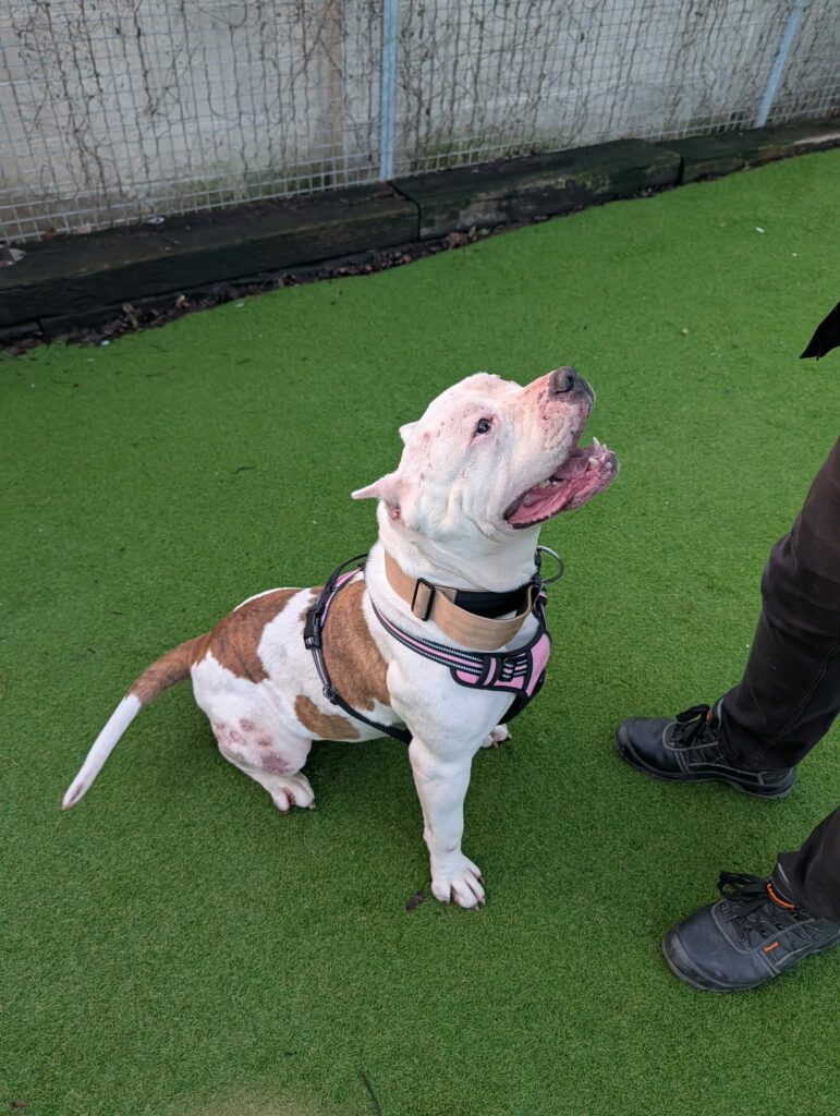 Beautiful big Marnie is the most special girl. She is an almost 6 yr old American Bulldog and an absolute big softie who adores everyone she meets and greets everyone with the wiggliest bum! Marnie needs a home (or foster) with a family who have large breed experience just because she’s a big girl, so has strength behind her if she does pull on lead, but she is generally very laid back. She mostly walks very well on lead and listens well to asking her to slow up if she’s getting a bit excited, but when she does pull to something excited, she will need someone confident and capable of handling her. Marnie is totally clean in her kennel, so she appears to be fully housetrained. She is very quiet and settled when she’s left on her own, and doesn’t chew, so we think she’ll be happy being left on her own for a few hours with no issues at all. She also travels well – what a good girl!! Marnie will be best suited to a pet free home at the moment – she has lived with other dogs, and cats, previously, but she is currently a bit ‘defensive’ around other dogs and doesn’t like being barked at (she’ll have a bark back), so whilst she is settling down, finding her feet and bonding with a new family, we think a pet free environment will be best for her. Marnie has sadly had her ears ‘cropped’ at some point in her past – this makes her appearance much harsher than the reality of what she is really like and we really hope people can see past this and see her for the loving big softie that she really is. She’s an amazing girl who deserves the absolute world from now on.