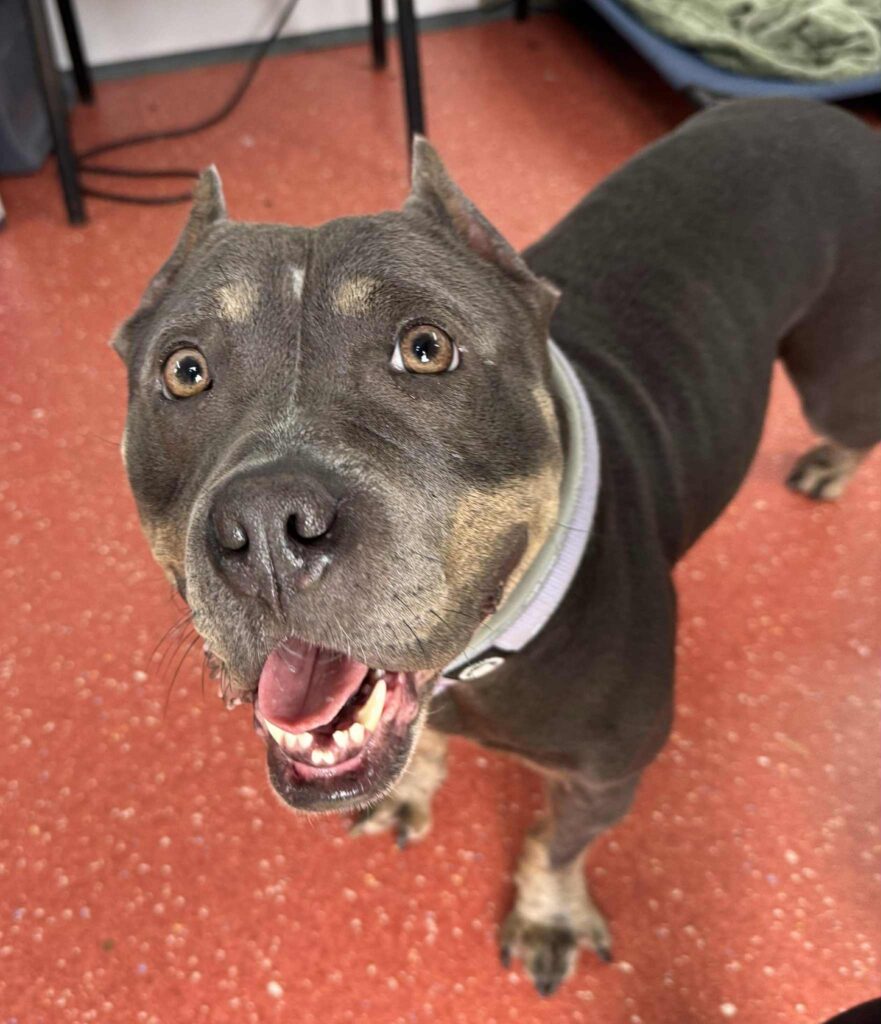 Patsy is a gorgeous medium/large sized bully breed – around 33kg, so is quite a chunky girl but is very chilled out and easy going. We do not know her exact age, but estimate her to be around 4 yrs old. Patsy needs a calm/quiet household – she is such a good girl who is very easy and undemanding around the house – she just needs a calm, confident person to understand her. She walks nicely on lead and is very low energy, so just needs a couple of shorter walks per day. Patsy is ‘OK’ with other dogs around similar size to her, and has shared a home with a male dog previously, but we think she will do best as the only dog. She is a definite no to cats! Patsy is clean in the house, is absolutely fine to be left alone for a few hours. She can get easily over excited for eg with visitors, and needs clear boundaries and structure to keep her nice and calm. She thrives on a good routine. She will need a home with direct access to a private secure garden that she can sunbathe in to her hearts content and lounge around chomping on her beloved tennis balls! Patsy will be a dream for the right home – she has tons of character and really deserves to find her forever home with someone who ideally has Bully experience (or larger breed savvy) who will give her life after clearly having such a rubbish start to life. As is common with Bully breeds, Patsy does have very sensitive skin and is prone to ear infections and skin flare ups, which needs maintenance, the right diet (grain free fish based food seems best for her), and she currently takes Apoquel.