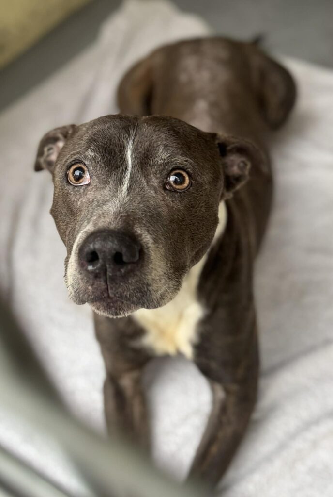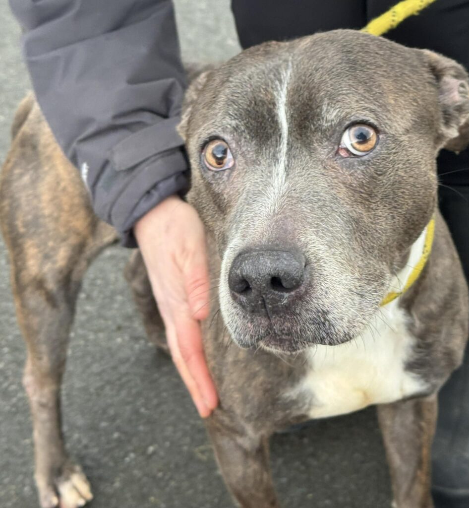 Good boy Murphy is the most lovely Staffy who is approx 6-7 yrs old. He is a very friendly boy and very well behaved. Murphy loves his walks and walks well on lead. He has been fine around other dogs (not particularly interested in them), and isn’t phased by other dogs running up to him out and about. Murphy is housetrained, loves his cuddles and does his very best ‘begging’ meercat trick for a treat! Being a typical Staffy, he loves people and loves company, and does not like being ‘shut away’ from his people, so he will need a home where he’ll get plenty of company and free run of the house. He really is the best of boys and will make his new family so happy.